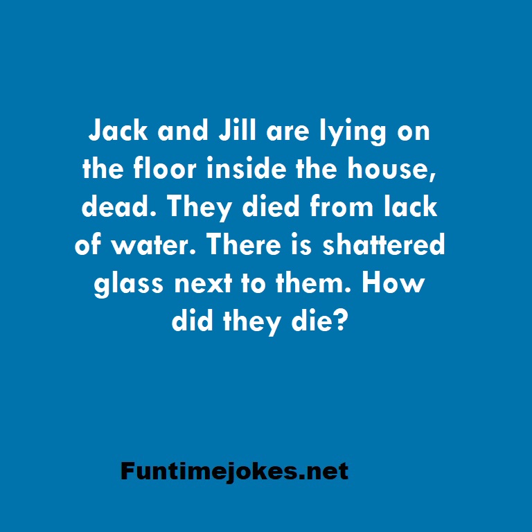 Jack and Jill are lying on the floor inside the house, dead. They died from lack of water. There is shattered glass next to them. How did they die? is one of the best riddle of the day.We have best collections of riddles, You can see our best collection of Tricky Riddles with Answer