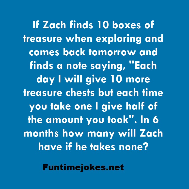 If Zach finds 10 boxes of treasure when exploring and comes back tomorrow and finds a note saying, "Each day I will give 10 more treasure chests but each time you take one I give half of the amount you took". In 6 months how many will Zach have if he takes none? is one of the best riddle of the day.We have best collections of riddles, You can see our best collection of Tricky Riddles with Answer Funtimejokes be the be the world's most knowledge able riddle website on the internet for riddles, puzzles, rebus caps and quizzes. Our riddle library has interesting riddles and answers to riddles for adults and evoke deep thought and community discussion. Riddlers will benefit from the creativity of our members who participate in growth of our online riddles and puzzles resource. We encourage you to become a member of Riddles and receive daily/weekly free riddles email.