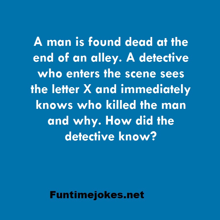 A man is found dead at the end of an alley. A detective who enters the scene sees the letter X and immediately knows who killed the man and why. How did the detective know? is one of the best riddle of the day.We have best collections of riddles, You can see our best collection of Tricky Riddles with Answer
