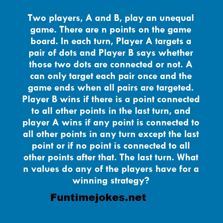 Two players, A and B, play an unequal game. There are n points on the game board. In each turn, Player A targets a pair of dots and Player B says whether those two dots are connected or not. A can only target each pair once and the game ends when all pairs are targeted. Player B wins if there is a point connected to all other points in the last turn, and player A wins if any point is connected to all other points in any turn except the last point or if no point is connected to all other points after that. The last turn. What n values do any of the players have for a winning strategy? is one of the best riddle of the day.We have best collections of riddles, You can see our best collection of Tricky Riddles with Answer