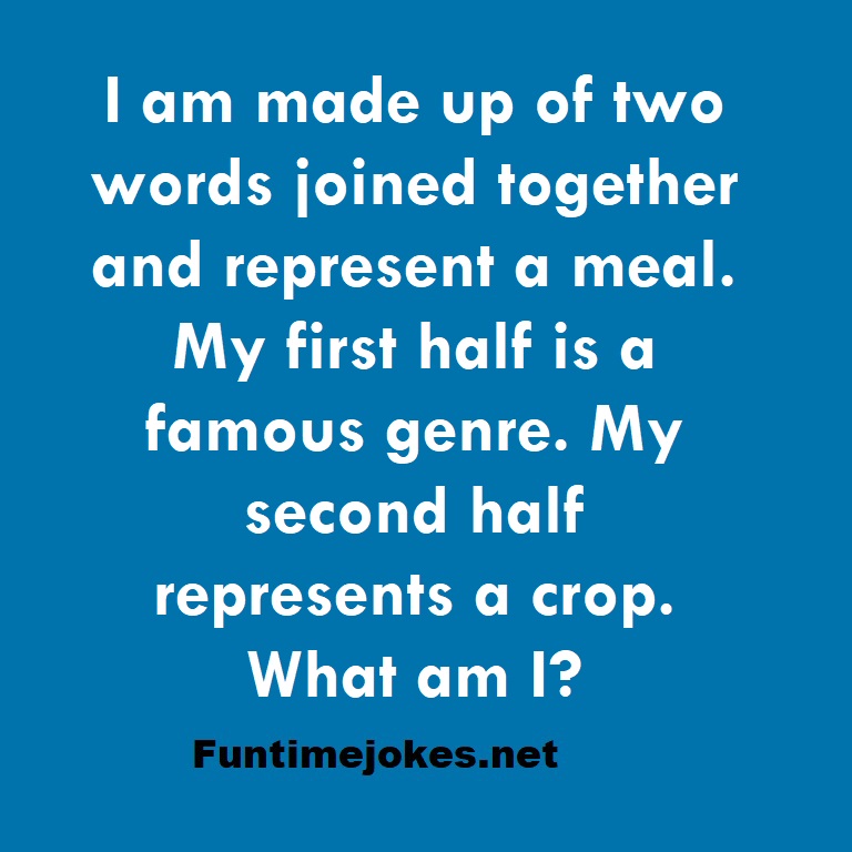 I am made up of two words joined together and represent a meal. My first half is a famous genre. My second half represents a crop. What am I? is one of the best riddle of the day.We have best collections of riddles, You can see our best collection of Tricky Riddles with Answer