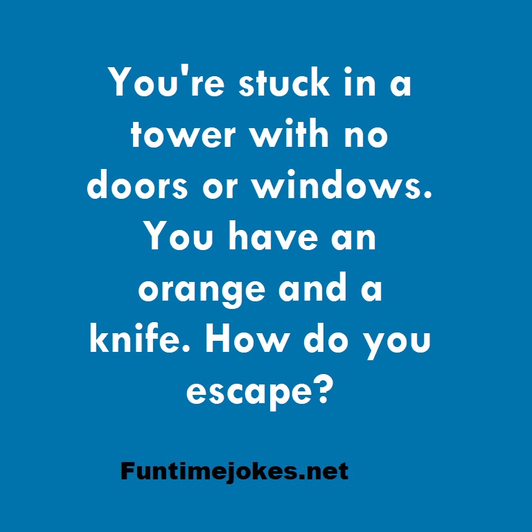 You're stuck in a tower with no doors or windows. You have an orange and a knife. How do you escape? is one of the best riddle of the day.We have best collections of riddles, You can see our best collection of Tricky Riddles with Answer
