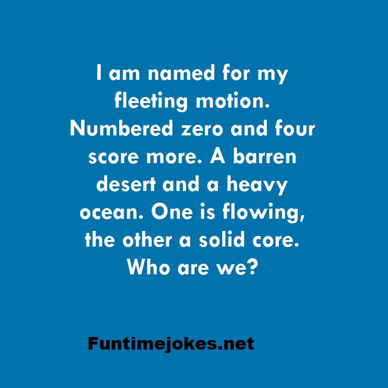 I am named for my fleeting motion. Numbered zero and four score more. A barren desert and a heavy ocean. One is flowing, the other a solid core. Who are we? is one of the best riddle of the day.We have best collections of riddles, You can see our best collection of Tricky Riddles with Answer
