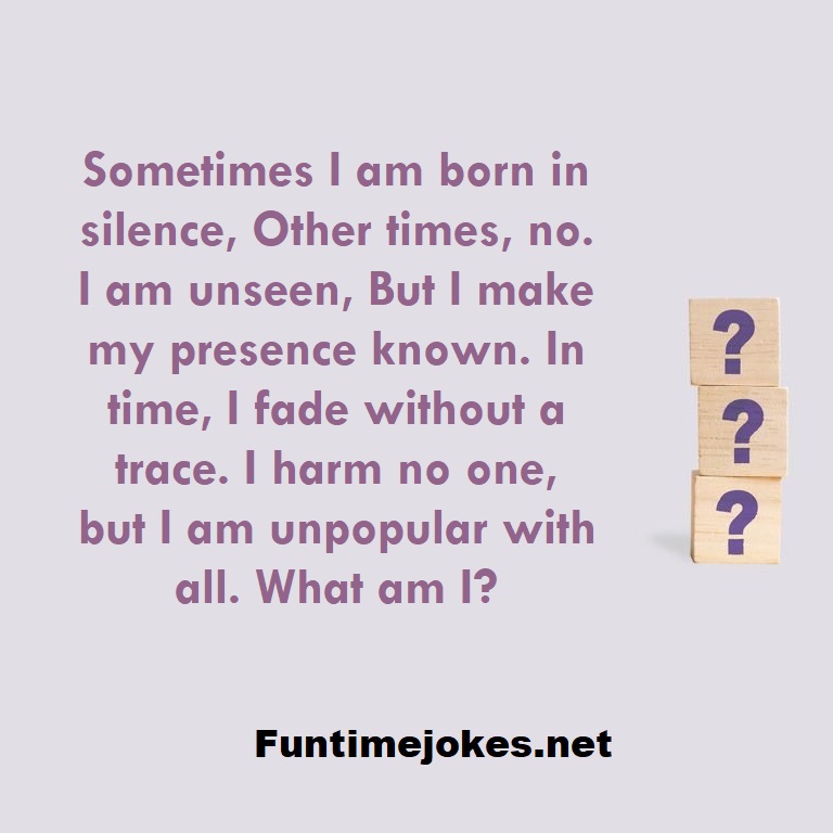 Sometimes I am born in silence, Other times, no. I am unseen, But I make my presence known. In time, I fade without a trace. I harm no one, but I am unpopular with all. What am I? is one of the best riddle of the day.We have best collections of riddles, You can see our best collection of Tricky Riddles with Answer