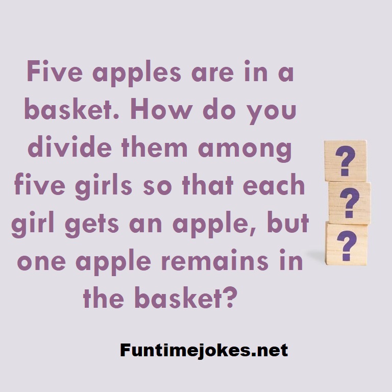 Five apples are in a basket. How do you divide them among five girls so that each girl gets an apple, but one apple remains in the basket? is one of the best riddle of the day.We have best collections of riddles, You can see our best collection of Tricky Riddles with Answer