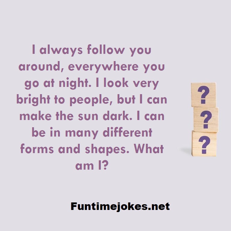 I always follow you around, everywhere you go at night. I look very bright to people, but I can make the sun dark. I can be in many different forms and shapes. What am I? is one of the best riddle of the day.We have best collections of riddles, You can see our best collection of Tricky Riddles with Answer