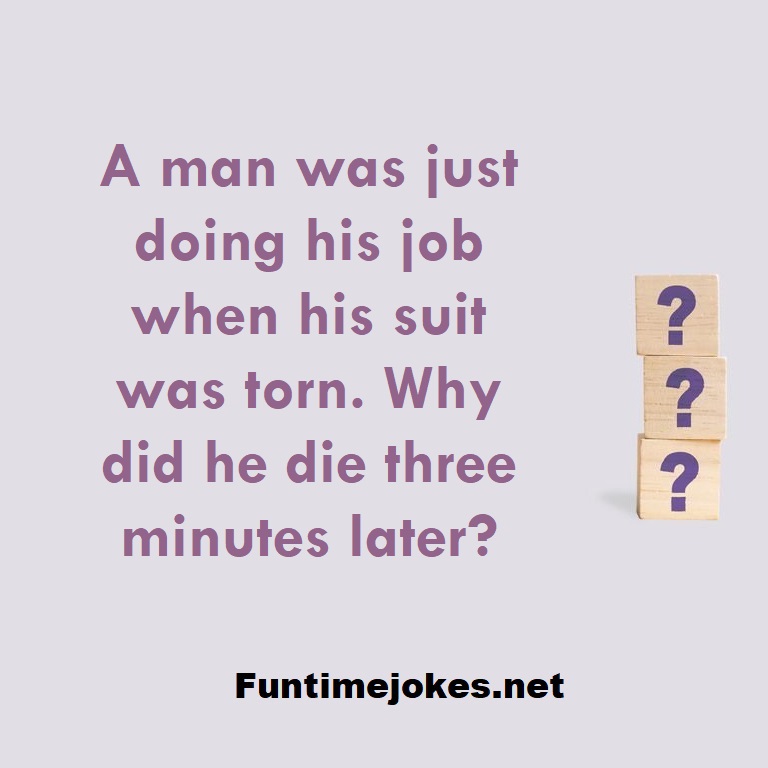 A man was just doing his job when his suit was torn. Why did he die three minutes later? is one of the best riddle of the day.We have best collections of riddles, You can see our best collection of Tricky Riddles with Answer