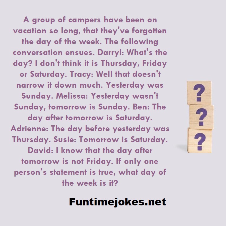 A group of campers have been on vacation so long, that they've forgotten the day of the week. The following conversation ensues. Darryl: What's the day? I don't think it is Thursday, Friday or Saturday. Tracy: Well that doesn't narrow it down much. Yesterday was Sunday. Melissa: Yesterday wasn't Sunday, tomorrow is Sunday. Ben: The day after tomorrow is Saturday. Adrienne: The day before yesterday was Thursday. Susie: Tomorrow is Saturday. David: I know that the day after tomorrow is not Friday. If only one person's statement is true, what day of the week is it? is one of the best riddle of the day.We have best collections of riddles, You can see our best collection of Tricky Riddles with Answer