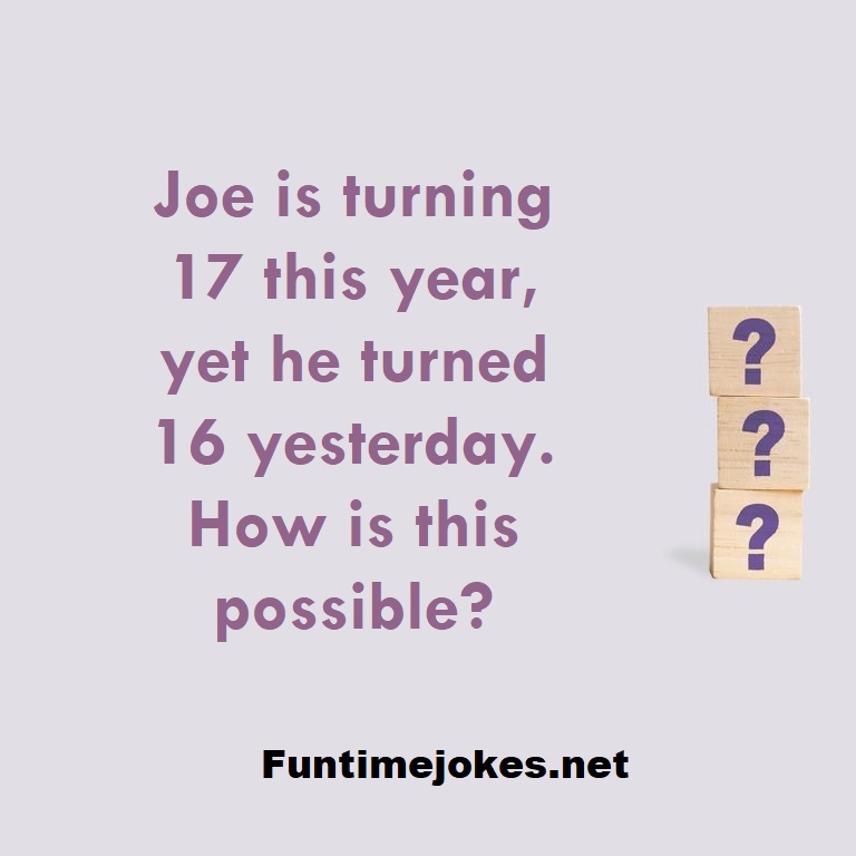 Joe is turning 17 this year, yet he turned 16 yesterday. How is this possible? is one of the best riddle of the day.We have best collections of riddles, You can see our best collection of Tricky Riddles with Answer