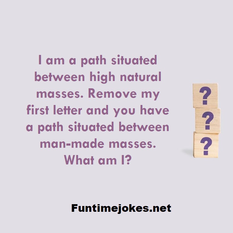 I am a path situated between high natural masses. Remove my first letter and you have a path situated between man-made masses. What am I? is one of the best riddle of the day.We have best collections of riddles, You can see our best collection of Tricky Riddles with Answer