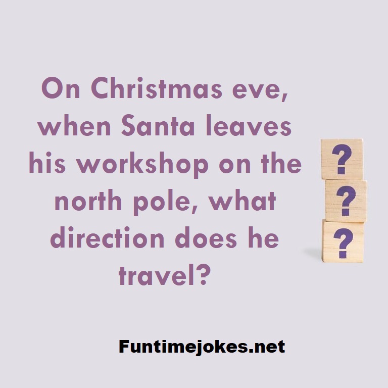 On Christmas eve, when Santa leaves his workshop on the north pole, what direction does he travel? is one of the best riddle of the day.We have best collections of riddles, You can see our best collection of Tricky Riddles with Answer