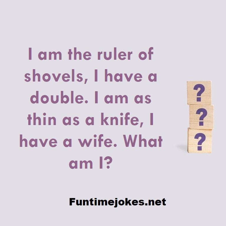 I am the ruler of shovels, I have a double. I am as thin as a knife, I have a wife. What am I? is one of the best riddle of the day.We have best collections of riddles, You can see our best collection of Tricky Riddles with Answer