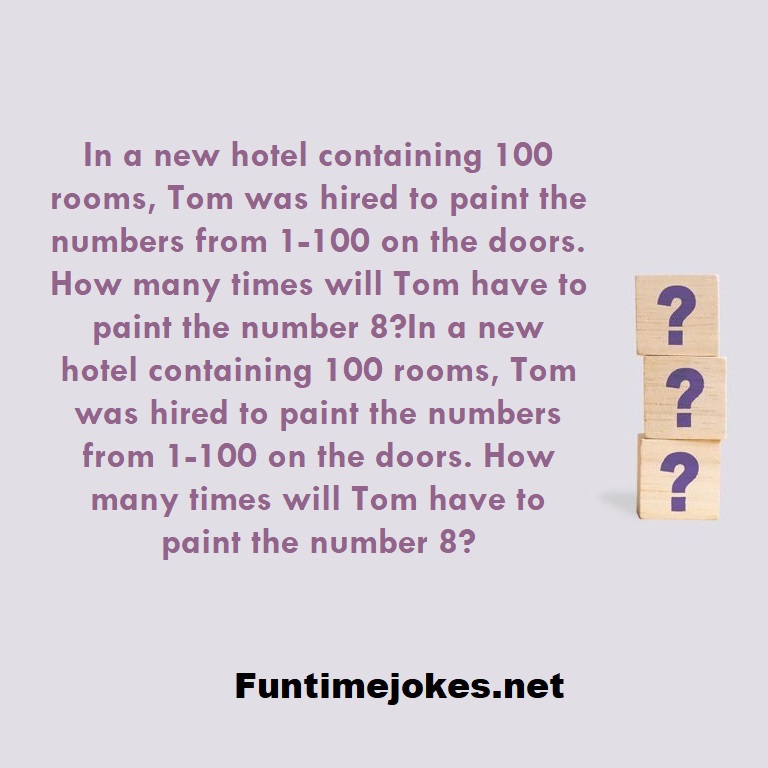 In a new hotel containing 100 rooms, Tom was hired to paint the numbers from 1-100 on the doors. How many times will Tom have to paint the number 8?In a new hotel containing 100 rooms, Tom was hired to paint the numbers from 1-100 on the doors. How many times will Tom have to paint the number 8? is one of the best riddle of the day.We have best collections of riddles, You can see our best collection of Tricky Riddles with Answer