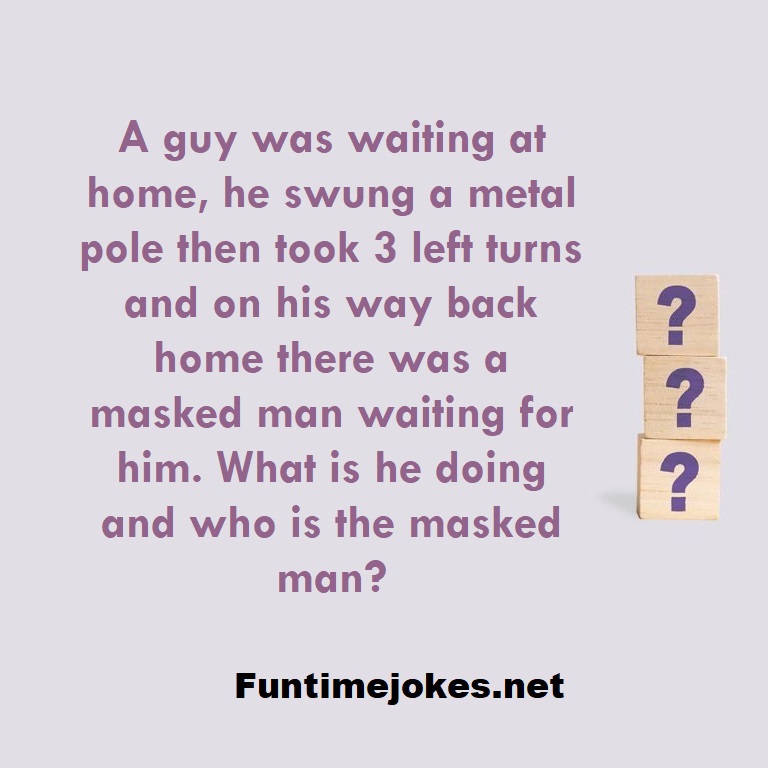 A guy was waiting at home, he swung a metal pole then took 3 left turns and on his way back home there was a masked man waiting for him. What is he doing and who is the masked man? is one of the best riddle of the day.We have best collections of riddles, You can see our best collection of Tricky Riddles with Answer