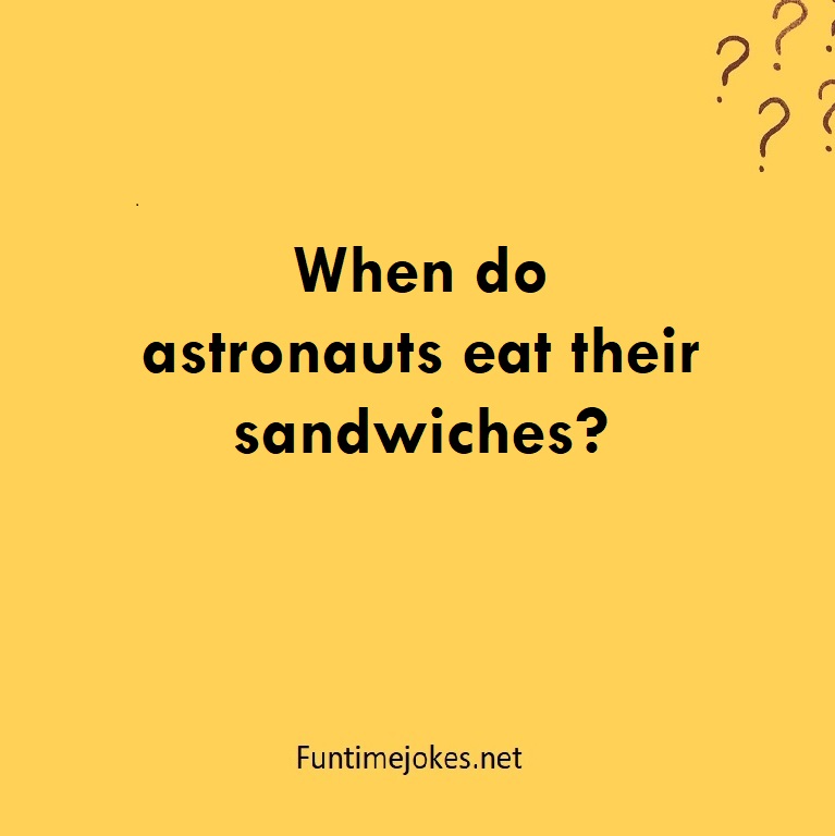 When do astronauts eat their sandwiches? is one of the best riddle of the day.We have best collections of riddles, You can see our best collection of Tricky Riddles with Answer
