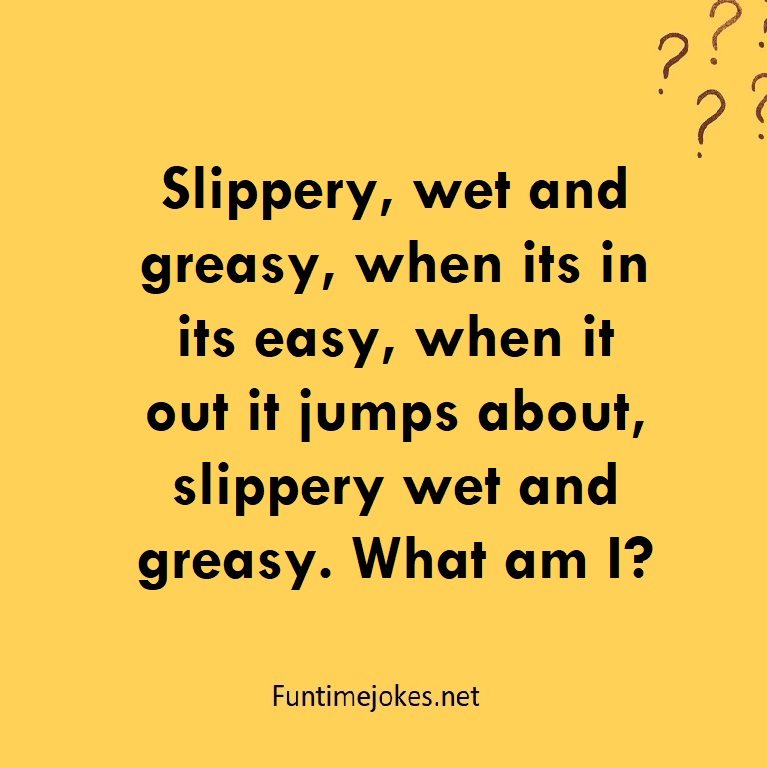Slippery, wet and greasy, when its in its easy, when it out it jumps about, slippery wet and greasy. What am I? is one of the best riddle of the day.We have best collections of riddles, You can see our best collection of Tricky Riddles with Answer