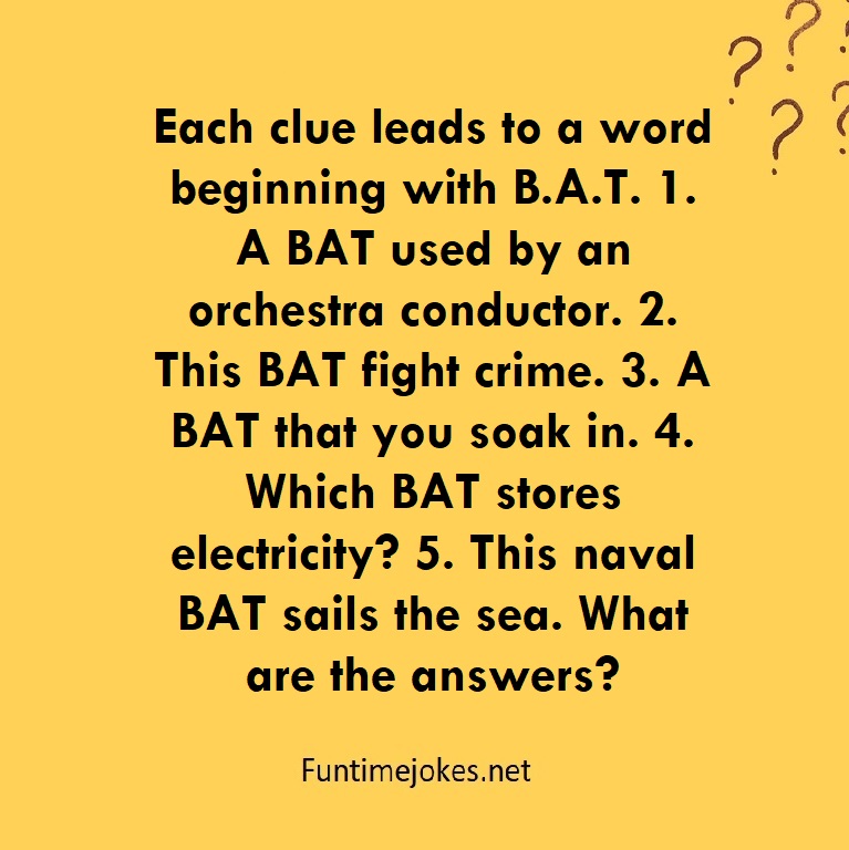 Each clue leads to a word beginning with B.A.T. 1. A BAT used by an orchestra conductor. 2. This BAT fight crime. 3. A BAT that you soak in. 4. Which BAT stores electricity? 5. This naval BAT sails the sea. What are the answers? is one of the best riddle of the day.We have best collections of riddles, You can see our best collection of Tricky Riddles with Answer