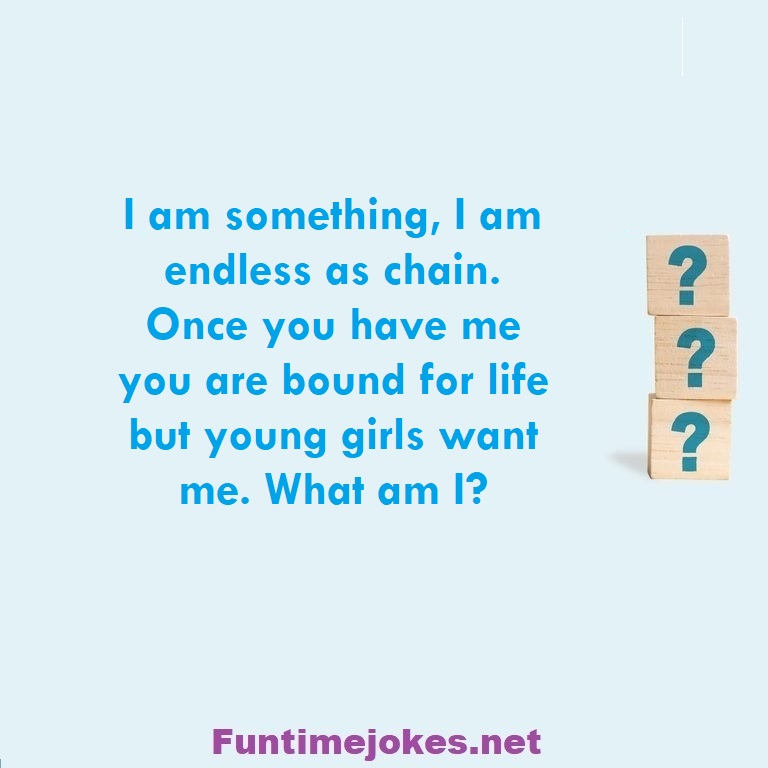 I am something, I am endless as chain. Once you have me you are bound for life but young girls want me. What am I? is one of the best riddle of the day.We have best collections of riddles, You can see our best collection of Tricky Riddles with Answer