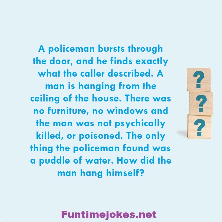 A policeman bursts through the door, and he finds exactly what the caller described. A man is hanging from the ceiling of the house. There was no furniture, no windows and the man was not psychically killed, or poisoned. The only thing the policeman found was a puddle of water. How did the man hang himself? is one of the best riddle of the day.We have best collections of riddles, You can see our best collection of Tricky Riddles with Answer