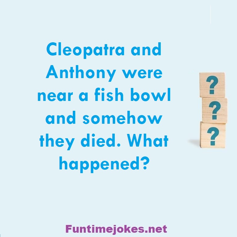 Cleopatra and Anthony were near a fish bowl and somehow they died. What happened? is one of the best riddle of the day.We have best collections of riddles, You can see our best collection of Tricky Riddles with Answer