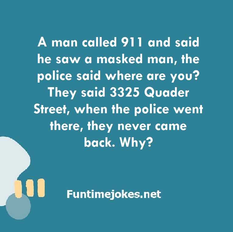 A man called 911 and said he saw a masked man, the police said where are you? They said 3325 Quader Street, when the police went there, they never came back. Why? is one of the best riddle of the day.We have best collections of riddles, You can see our best collection of Tricky Riddles with Answer