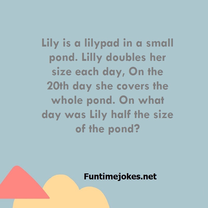 Lily is a lilypad in a small pond. Lilly doubles her size each day, On the 20th day she covers the whole pond. On what day was Lily half the size of the pond? is one of the best riddle of the day.We have best collections of riddles, You can see our best collection of Tricky Riddles with Answer