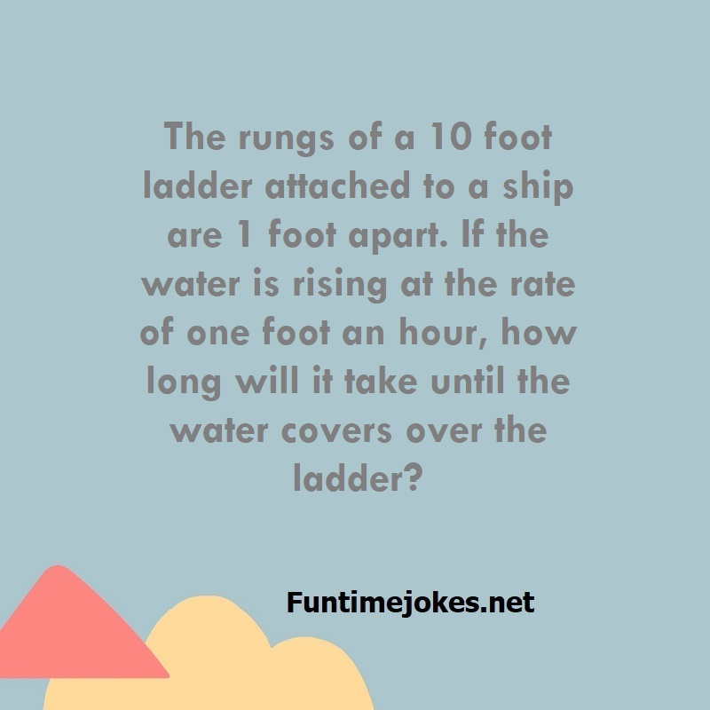 The rungs of a 10 foot ladder attached to a ship are 1 foot apart. If the water is rising at the rate of one foot an hour, how long will it take until the water covers over the ladder? is one of the best riddle of the day.We have best collections of riddles, You can see our best collection of Tricky Riddles with Answer