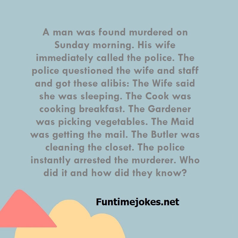 A man was found murdered on Sunday morning. His wife immediately called the police. The police questioned the wife and staff and got these alibis: The Wife said she was sleeping. The Cook was cooking breakfast. The Gardener was picking vegetables. The Maid was getting the mail. The Butler was cleaning the closet. The police instantly arrested the murderer. Who did it and how did they know? is one of the best riddle of the day.We have best collections of riddles, You can see our best collection of Tricky Riddles with Answer