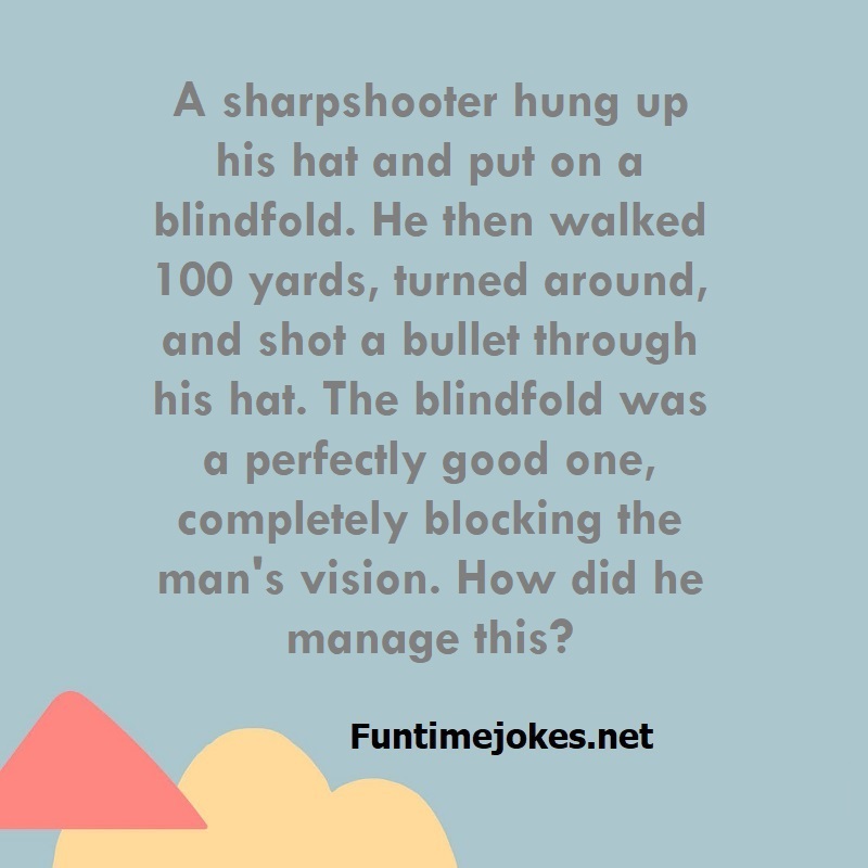 A sharpshooter hung up his hat and put on a blindfold. He then walked 100 yards, turned around, and shot a bullet through his hat. The blindfold was a perfectly good one, completely blocking the man's vision. How did he manage this? is one of the best riddle of the day.We have best collections of riddles, You can see our best collection of Tricky Riddles with Answer