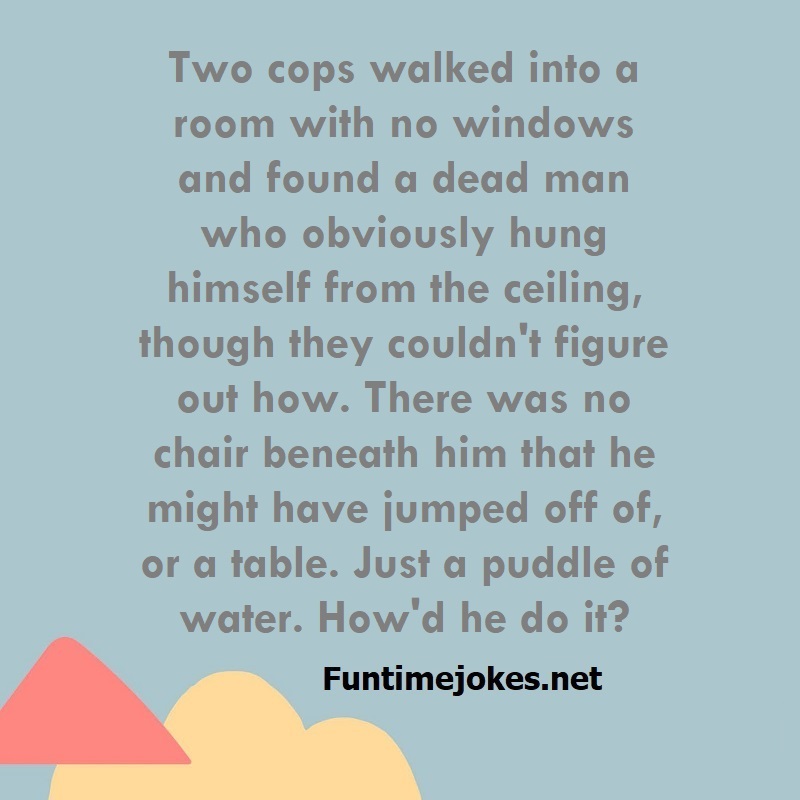Two cops walked into a room with no windows and found a dead man who obviously hung himself from the ceiling, though they couldn't figure out how. There was no chair beneath him that he might have jumped off of, or a table. Just a puddle of water. How'd he do it? is one of the best riddle of the day.We have best collections of riddles, You can see our best collection of Tricky Riddles with Answer