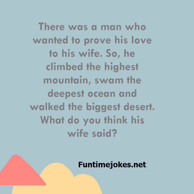 There was a man who wanted to prove his love to his wife. So, he climbed the highest mountain, swam the deepest ocean and walked the biggest desert. What do you think his wife said? is one of the best riddle of the day.We have best collections of riddles, You can see our best collection of Tricky Riddles with Answer