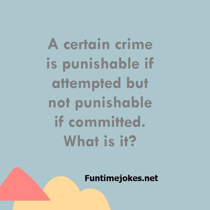 A certain crime is punishable if attempted but not punishable if committed. What is it? is one of the best riddle of the day.We have best collections of riddles, You can see our best collection of Tricky Riddles with Answer