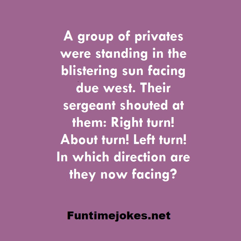 π Take the 15-Riddle Challenge (Win at 80%+)A group of privates were standing in the blistering sun facing due west. Their sergeant shouted at them: Right turn! About turn! Left turn! In which direction are they now facing?