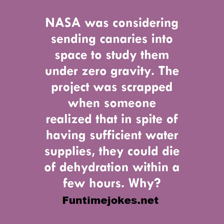 NASA was considering sending canaries into space to study them under zero gravity. The project was scrapped when someone realized that in spite of having sufficient water supplies, they could die of dehydration within a few hours. Why? is one of the best riddle of the day.We have best collections of riddles, You can see our best collection of Tricky Riddles with Answer
