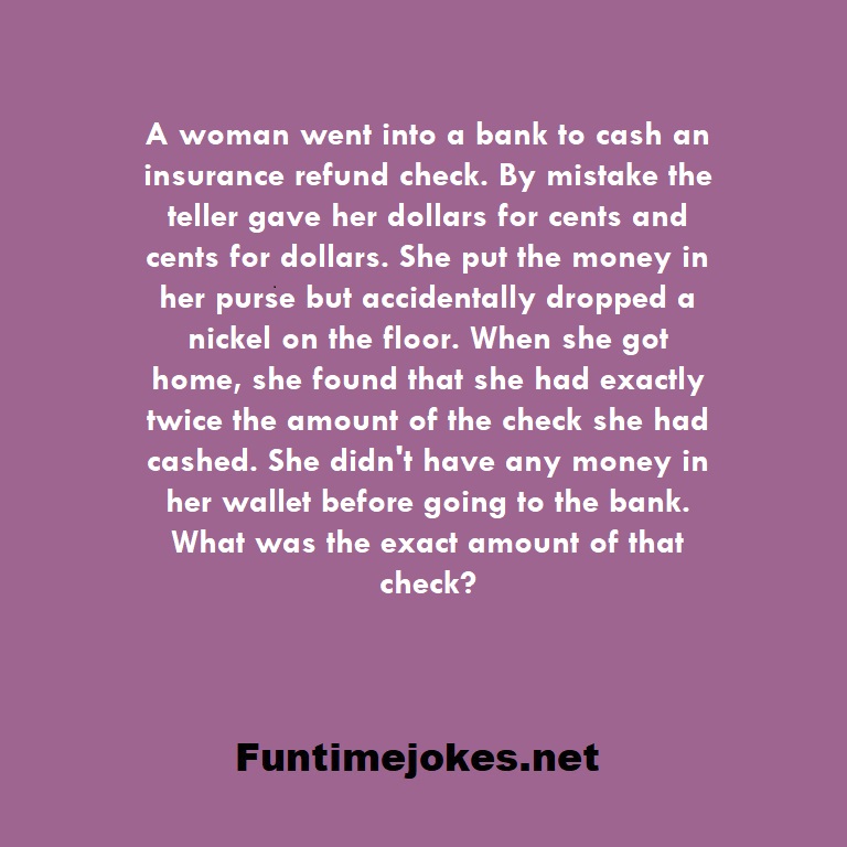 A woman went into a bank to cash an insurance refund check. By mistake the teller gave her dollars for cents and cents for dollars. She put the money in her purse but accidentally dropped a nickel on the floor. When she got home, she found that she had exactly twice the amount of the check she had cashed. She didn't have any money in her wallet before going to the bank. What was the exact amount of that check? is one of the best riddle of the day.We have best collections of riddles, You can see our best collection of Tricky Riddles with Answer