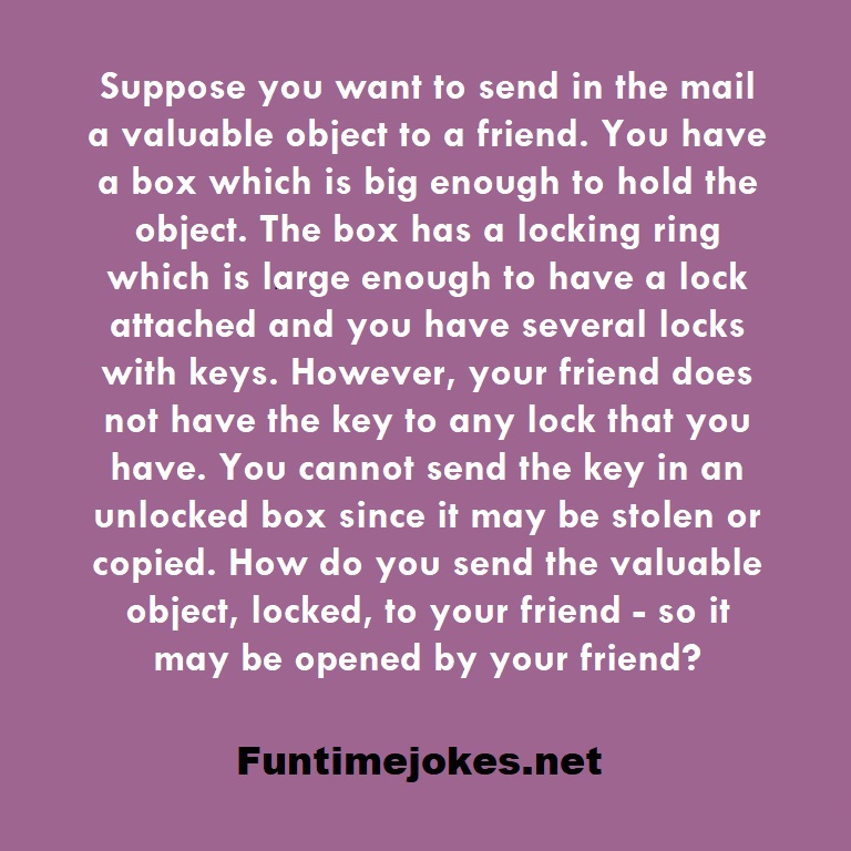 Suppose you want to send in the mail a valuable object to a friend. You have a box which is big enough to hold the object. The box has a locking ring which is large enough to have a lock attached and you have several locks with keys. However, your friend does not have the key to any lock that you have. You cannot send the key in an unlocked box since it may be stolen or copied. How do you send the valuable object, locked, to your friend - so it may be opened by your friend? is one of the best riddle of the day.We have best collections of riddles, You can see our best collection of Tricky Riddles with Answer