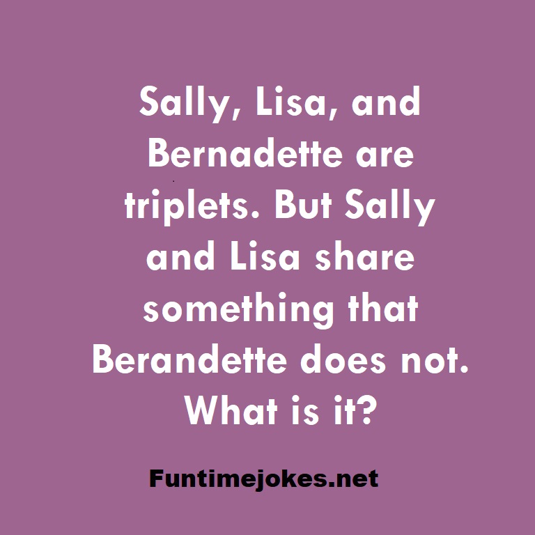 Sally, Lisa, and Bernadette are triplets. But Sally and Lisa share something that Berandette does not. What is it? is one of the best riddle of the day.We have best collections of riddles, You can see our best collection of Tricky Riddles with Answer