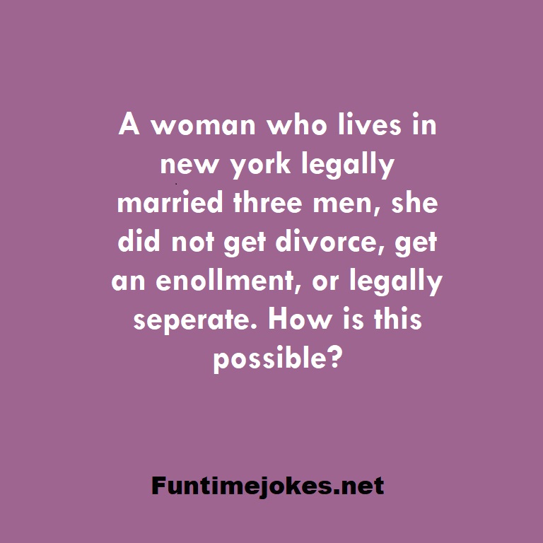 A woman who lives in new york legally married three men, she did not get divorce, get an enollment, or legally seperate. How is this possible? is one of the best riddle of the day.We have best collections of riddles, You can see our best collection of Tricky Riddles with Answer