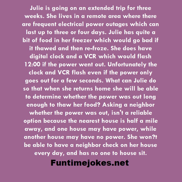 Julie is going on an extended trip for three weeks. She lives in a remote area where there are frequent electrical power outages which can last up to three or four days. Julie has quite a bit of food in her freezer which would go bad if it thawed and then re-froze. She does have digital clock and a VCR which would flash 12:00 if the power went out. Unfortunately the clock and VCR flash even if the power only goes out for a few seconds. What can Julie do so that when she returns home she will be able to determine whether the power was out long enough to thaw her food? Asking a neighbor whether the power was out, isn't a reliable option because the nearest house is half a mile away, and one house may have power, while another house may have no power. She won?t be able to have a neighbor check on her house every day, and has no one to house sit. is one of the best riddle of the day.We have best collections of riddles, You can see our best collection of Tricky Riddles with Answer