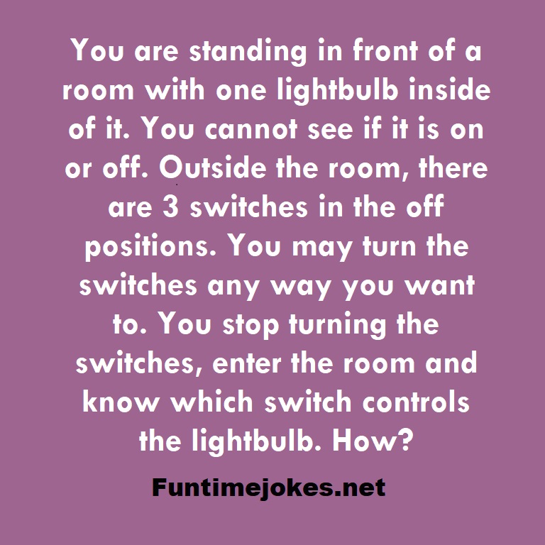 You are standing in front of a room with one lightbulb inside of it. You cannot see if it is on or off. Outside the room, there are 3 switches in the off positions. You may turn the switches any way you want to. You stop turning the switches, enter the room and know which switch controls the lightbulb. How? is one of the best riddle of the day.We have best collections of riddles, You can see our best collection of Tricky Riddles with Answer