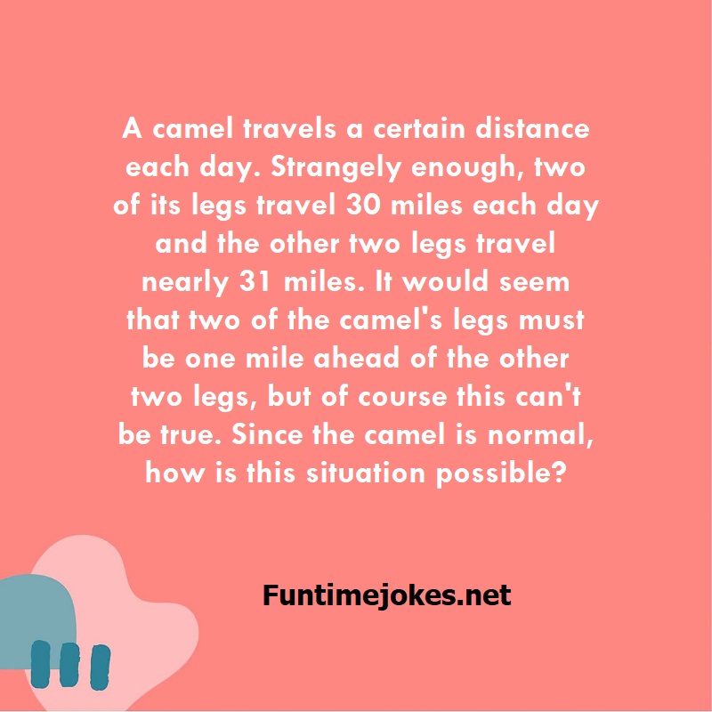 A camel travels a certain distance each day. Strangely enough, two of its legs travel 30 miles each day and the other two legs travel nearly 31 miles. It would seem that two of the camel's legs must be one mile ahead of the other two legs, but of course this can't be true. Since the camel is normal, how is this situation possible? is one of the best riddle of the day.We have best collections of riddles, You can see our best collection of Tricky Riddles with Answer