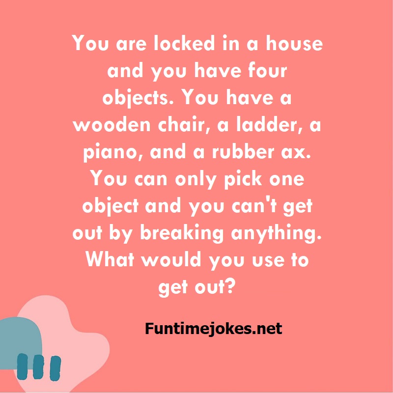 You are locked in a house and you have four objects. You have a wooden chair, a ladder, a piano, and a rubber ax. You can only pick one object and you can't get out by breaking anything. What would you use to get out? is one of the best riddle of the day.We have best collections of riddles, You can see our best collection of Tricky Riddles with Answer