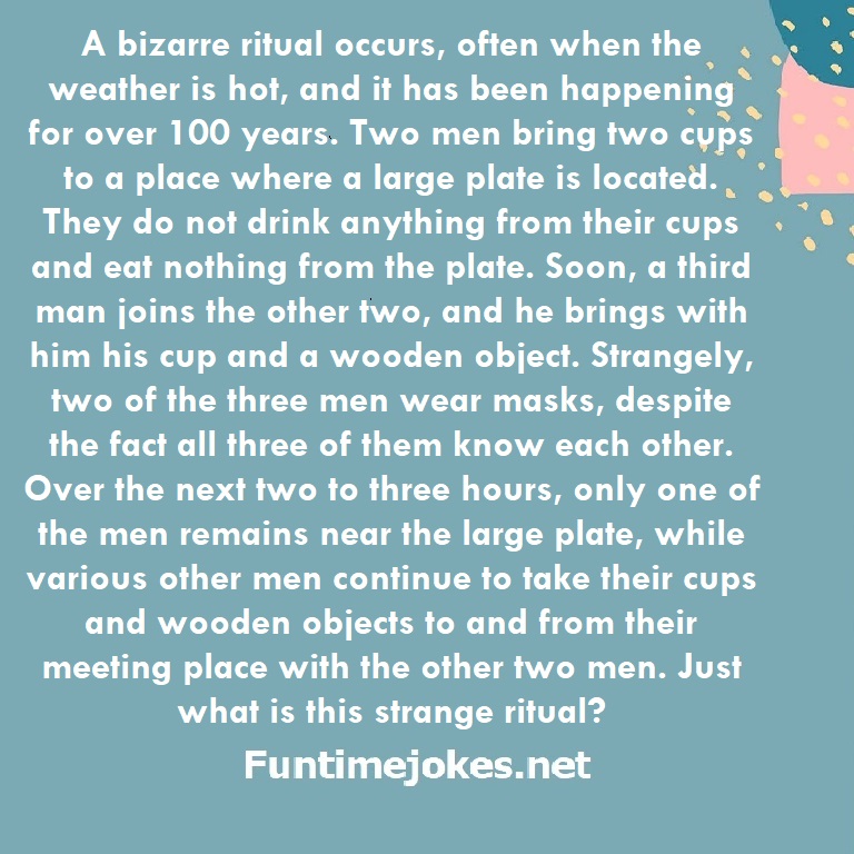 A bizarre ritual occurs, often when the weather is hot, and it has been happening for over 100 years. Two men bring two cups to a place where a large plate is located. They do not drink anything from their cups and eat nothing from the plate. Soon, a third man joins the other two, and he brings with him his cup and a wooden object. Strangely, two of the three men wear masks, despite the fact all three of them know each other. Over the next two to three hours, only one of the men remains near the large plate, while various other men continue to take their cups and wooden objects to and from their meeting place with the other two men. Just what is this strange ritual? is one of the best riddle of the day.We have best collections of riddles, You can see our best collection of Tricky Riddles with Answer