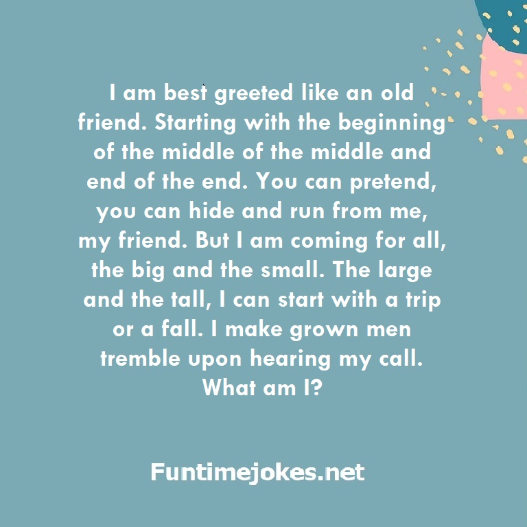 I am best greeted like an old friend. Starting with the beginning of the middle of the middle and end of the end. You can pretend, you can hide and run from me, my friend. But I am coming for all, the big and the small. The large and the tall, I can start with a trip or a fall. I make grown men tremble upon hearing my call. What am I? is one of the best riddle of the day.We have best collections of riddles, You can see our best collection of Tricky Riddles with Answer