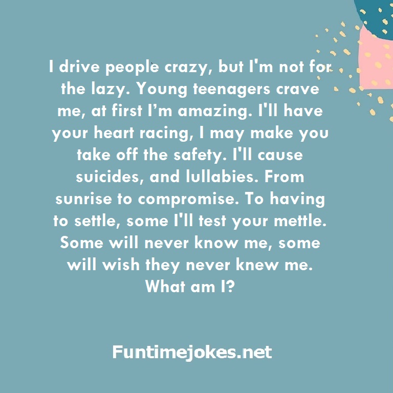 I drive people crazy, but I'm not for the lazy. Young teenagers crave me, at first I’m amazing. I'll have your heart racing, I may make you take off the safety. I'll cause suicides, and lullabies. From sunrise to compromise. To having to settle, some I'll test your mettle. Some will never know me, some will wish they never knew me. What am I? is one of the best riddle of the day.We have best collections of riddles, You can see our best collection of Tricky Riddles with Answer