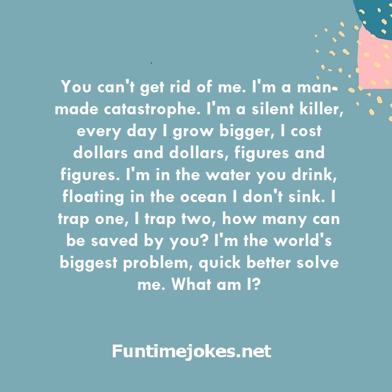You can't get rid of me. I'm a man-made catastrophe. I'm a silent killer, every day I grow bigger, I cost dollars and dollars, figures and figures. I'm in the water you drink, floating in the ocean I don't sink. I trap one, I trap two, how many can be saved by you? I'm the world's biggest problem, quick better solve me. What am I? is one of the best riddle of the day.We have best collections of riddles, You can see our best collection of Tricky Riddles with Answer