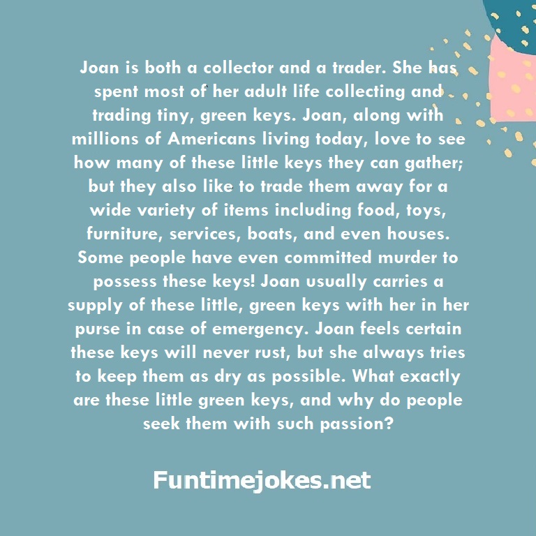 Joan is both a collector and a trader. She has spent most of her adult life collecting and trading tiny, green keys. Joan, along with millions of Americans living today, love to see how many of these little keys they can gather; but they also like to trade them away for a wide variety of items including food, toys, furniture, services, boats, and even houses. Some people have even committed murder to possess these keys! Joan usually carries a supply of these little, green keys with her in her purse in case of emergency. Joan feels certain these keys will never rust, but she always tries to keep them as dry as possible. What exactly are these little green keys, and why do people seek them with such passion? is one of the best riddle of the day.We have best collections of riddles, You can see our best collection of Tricky Riddles with Answer