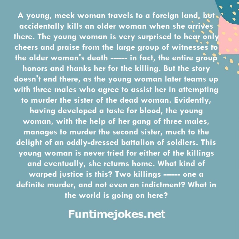 A young, meek woman travels to a foreign land, but accidentally kills an older woman when she arrives there. The young woman is very surprised to hear only cheers and praise from the large group of witnesses to the older woman's death ------ in fact, the entire group honors and thanks her for the killing. But the story doesn't end there, as the young woman later teams up with three males who agree to assist her in attempting to murder the sister of the dead woman. Evidently, having developed a taste for blood, the young woman, with the help of her gang of three males, manages to murder the second sister, much to the delight of an oddly-dressed battalion of soldiers. This young woman is never tried for either of the killings and eventually, she returns home. What kind of warped justice is this? Two killings ------ one a definite murder, and not even an indictment? What in the world is going on here? is one of the best riddle of the day.We have best collections of riddles, You can see our best collection of Tricky Riddles with Answer