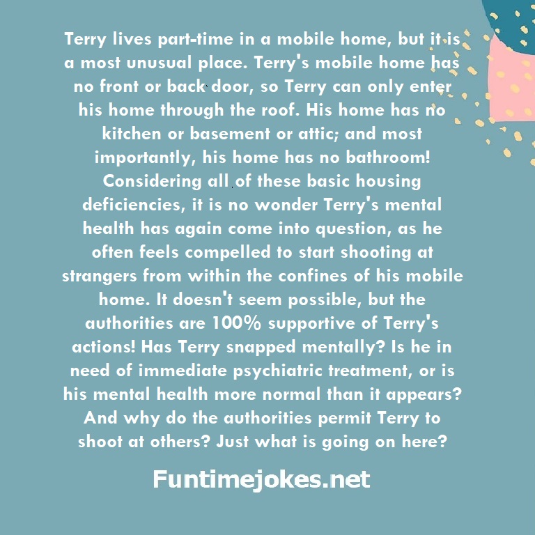 Terry lives part-time in a mobile home, but it is a most unusual place. Terry's mobile home has no front or back door, so Terry can only enter his home through the roof. His home has no kitchen or basement or attic; and most importantly, his home has no bathroom! Considering all of these basic housing deficiencies, it is no wonder Terry's mental health has again come into question, as he often feels compelled to start shooting at strangers from within the confines of his mobile home. It doesn't seem possible, but the authorities are 100% supportive of Terry's actions! Has Terry snapped mentally? Is he in need of immediate psychiatric treatment, or is his mental health more normal than it appears? And why do the authorities permit Terry to shoot at others? Just what is going on here? is one of the best riddle of the day.We have best collections of riddles, You can see our best collection of Tricky Riddles with Answer