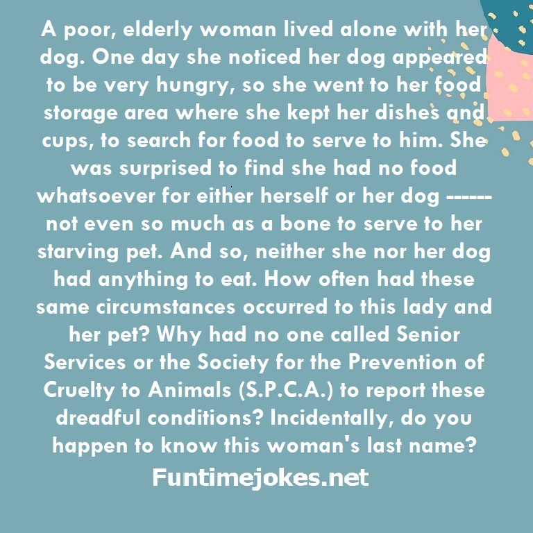 A poor, elderly woman lived alone with her dog. One day she noticed her dog appeared to be very hungry, so she went to her food storage area where she kept her dishes and cups, to search for food to serve to him. She was surprised to find she had no food whatsoever for either herself or her dog ------ not even so much as a bone to serve to her starving pet. And so, neither she nor her dog had anything to eat. How often had these same circumstances occurred to this lady and her pet? Why had no one called Senior Services or the Society for the Prevention of Cruelty to Animals (S.P.C.A.) to report these dreadful conditions? Incidentally, do you happen to know this woman's last name? is one of the best riddle of the day.We have best collections of riddles, You can see our best collection of Tricky Riddles with Answer